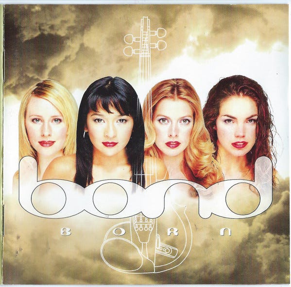 It’s Friday so we’re listening to something more upbeat. Today we’re listening to Bond, a British/Australian electric string quartet. The group – originally Haylie Ecker (violin), Eos Counsell (violin), Tania Davis (viola), and Gay-Yee Westerhoff (cello) – formed in 2000.1 Their innovation was to play classical arrangements over pop and dance rhythms, packaging orchestral virtuosity for Y2K ears. They ended up selling over five million albums, of which today we’re playing two. Born, their 2001 debut, adapts pieces by Tchaikovsky and Vivaldi, and features original compositions reflecting latin, jazz, and Indian influences. But first we’re playing their 2002 record, Shine, which includes a cover of Led Zeppelin’s “Kashmir” and the James Bond Theme.
